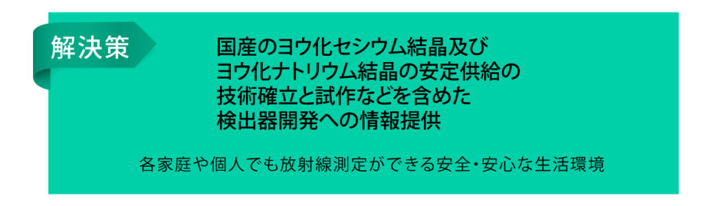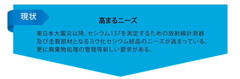 ヨウ化セシウム結晶は原発由来の放射性物質である、セシウム137を測定するための放射線検出機器のコア素材であり、東日本大震災での福島原子力発電所事故以来、農林業関連・食品関連において学校や家庭での放射線計測のニーズが高まっています。